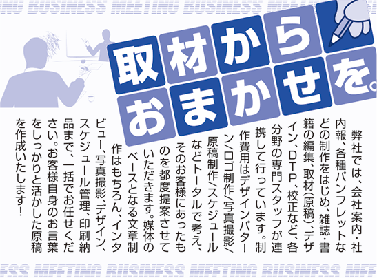 - 部数や用紙のサイズ、紙質、カラーかモノクロかというマテリアルのご提案からはじめさせていただきます。原稿、写真、デザイン、印刷まで全てお手伝いさせていただきます。